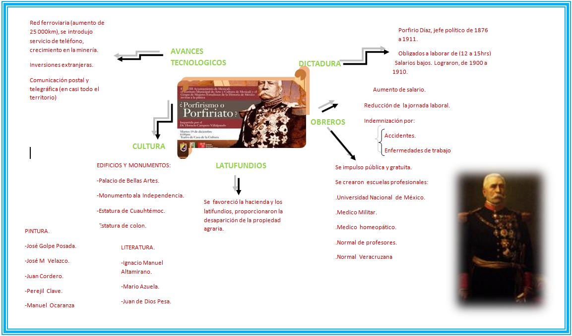 Es el período de 34 años en el que el poder en Mexico estuvo bajo control de Porfirio Diaz. Este período comprende de 1876 a mayo de 1911, cuando Díaz renunció a la presidencia por la Revolucion encabezada por Francisco I. Madero, Francisco Villa, Emiliano Zapata y los Hernamos Flores Magon. Durante el gobierno del general Porfirio Díaz se dio un giro en la actividad política nacional, puesto que logró de una vez por todas, a diferencia de los años anteriores, controlar de manera efectiva al Ejército. El Porfiriato también fue un periodo que provocó grandes desigualdades entre la población mexicana; pues la estabilidad económica y política generada en esos momentos sólo beneficio a un pequeño grupo y además de la supresión de numerosas libertades civiles de la época.